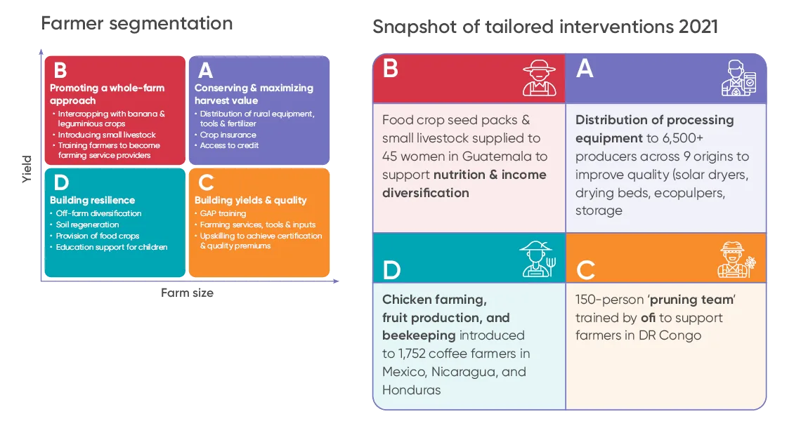 In 2020, we performed a detailed literature review and analysis to assess if we’re focusing on the right interventions to really make a difference to farmer profitability and close the gap on living income. While we’ve always known from our origination experience that there are no one-size-fits-all solutions, we’re now re-designing ofi’s extension services model and incorporating a farmer segmentation approach, where farmers are categorized and interventions tailored according to farm size, yields, skills and willingness to invest.